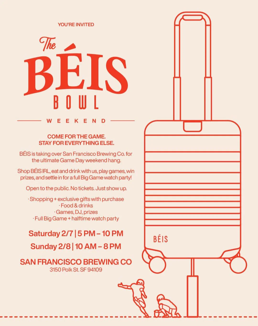 BÉIS is taking over San Francisco Brewing Co. for the ultimate Game Day weekend hang. Shop BÉIS IRL, eat and drink with us, play games, win prizes, and settle in for a full Big Game watch party.